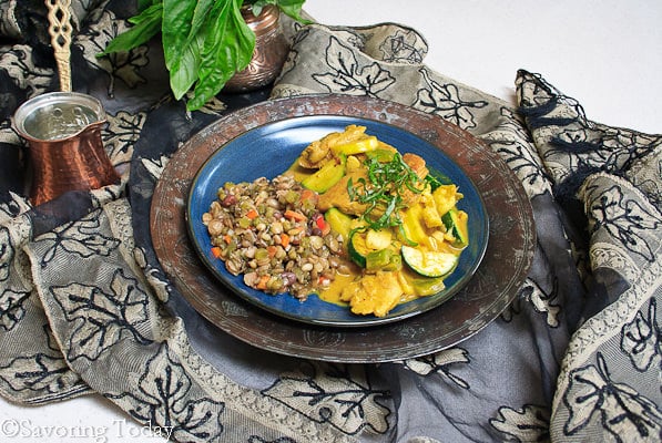 - Add the lemon juice, taste and adjust seasoning as desired. Garnish with basil and serve with rice or lentils.