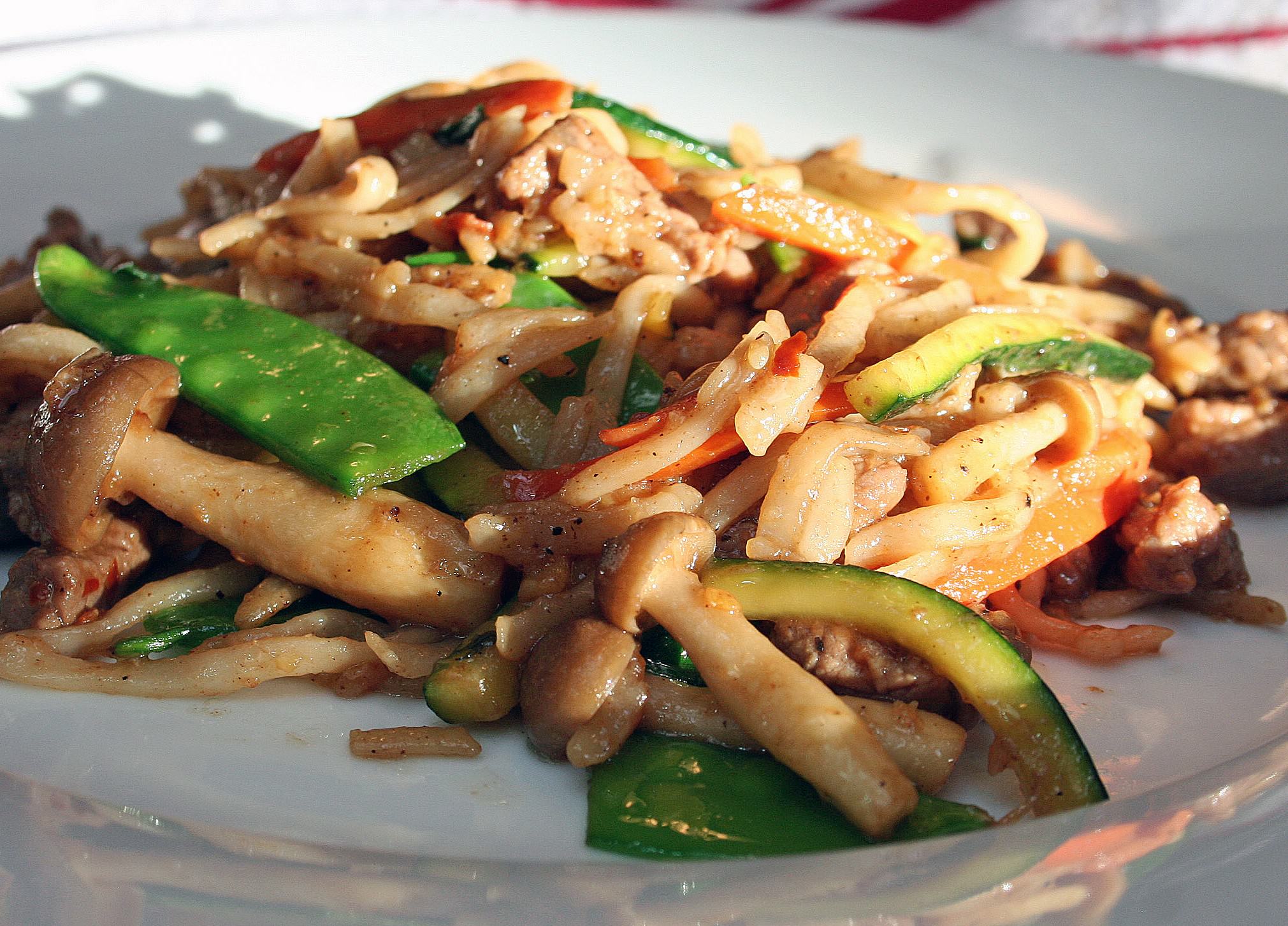 - In the same skillet, heat the remaining 1 tablespoons of oil over medium-high heat. Add the carrots, zucchini, bell pepper, green onion, mushrooms, and snow peas; cook for 2-3 minutes, then stir in the garlic and ginger. Cook an additional 2-3 minutes until fragrant and vegetables have softened.