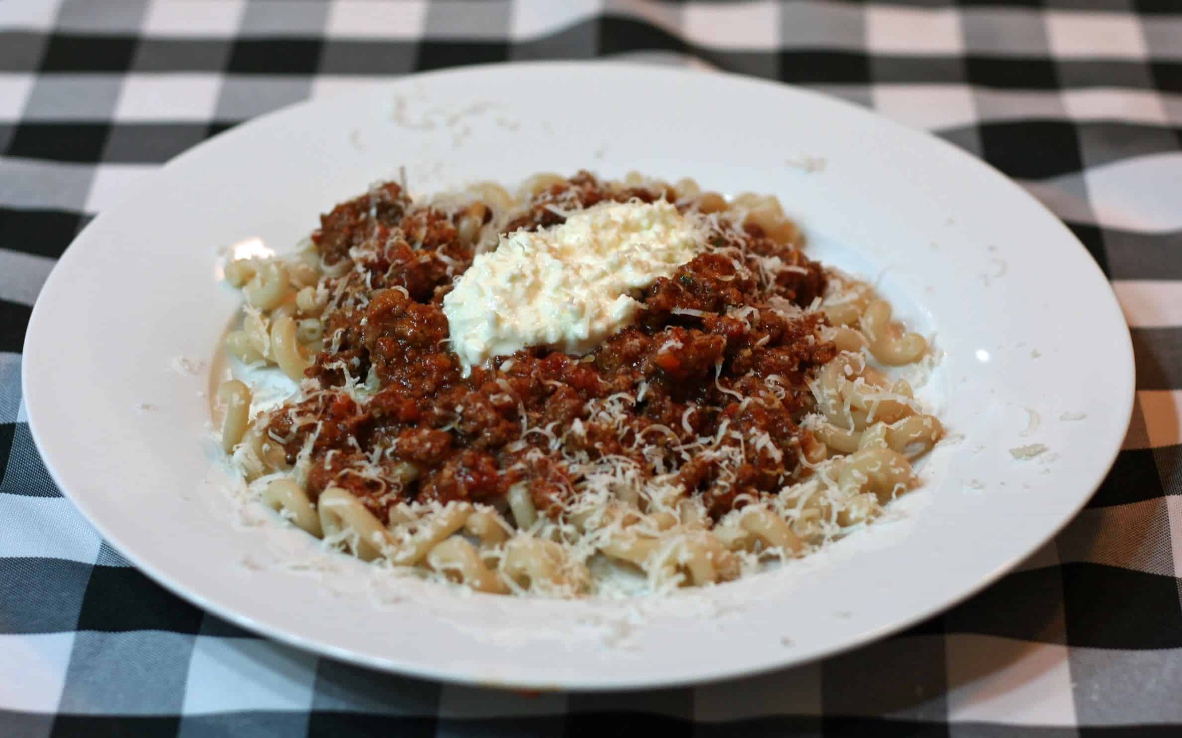 Spaghetti Bolognese served over gluten free pasta or and garnished with ricotta.